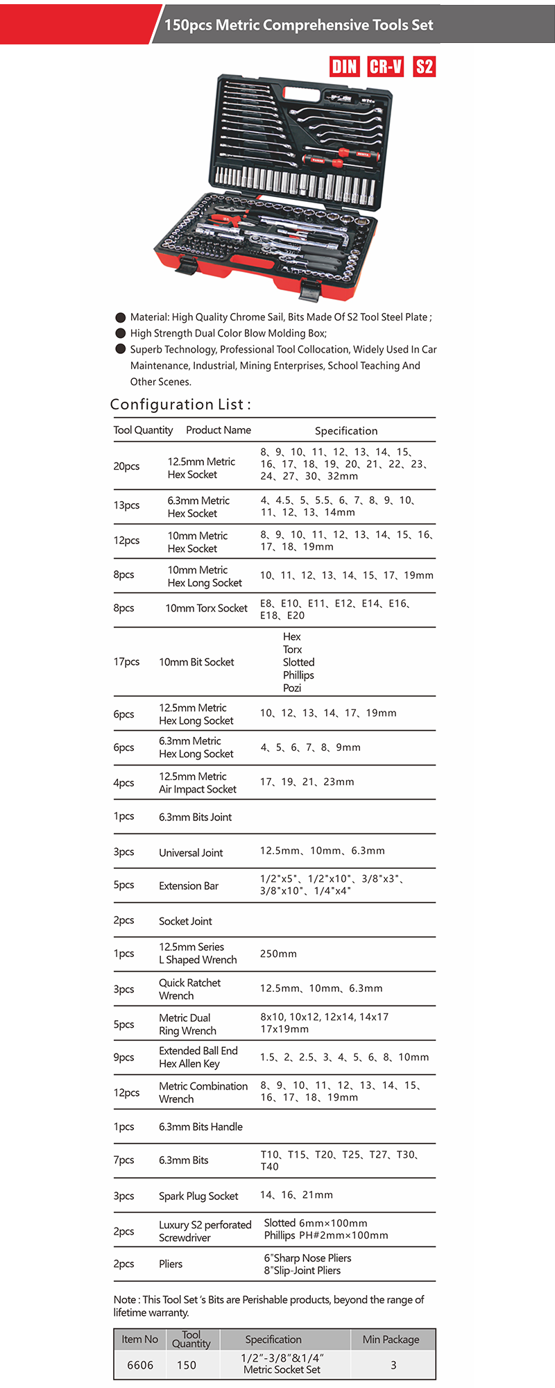 150 pcs metric comprehensive tool set